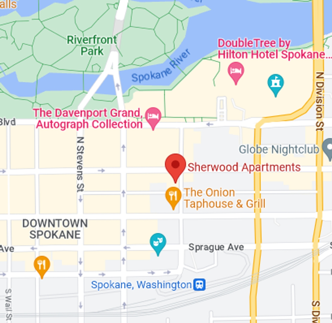 We are located in the heart of Spokane directly across the street from the Davenport Grand Hotel, one block to the only Chili's restaurant in the area, one block to the famous Aunties Bookstore, half block to The Onion Bar & Grill, half block to the Italian Kitchen, and 3 blocks to the Spokane Convention Center.